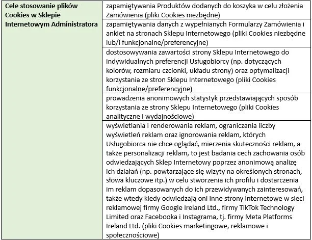 7.3. Administrator może przetwarzać dane zawarte w plikach Cookies podczas korzystania przez odwiedzających ze strony Sklepu Internetowego w następujących konkretnych celach: