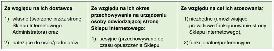 7.2. Pliki Cookies, które mogą być wysyłane przez stronę Sklepu Internetowego można podzielić na różne rodzaje, według